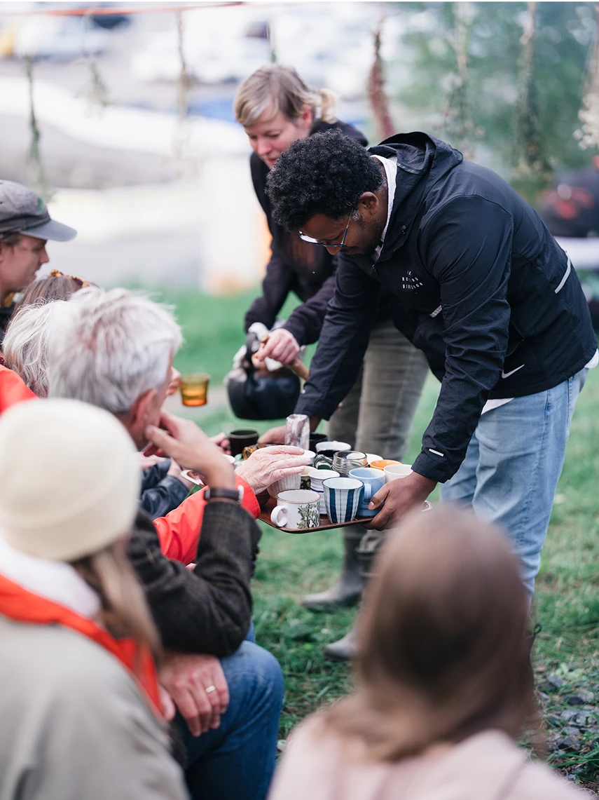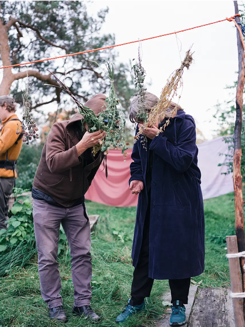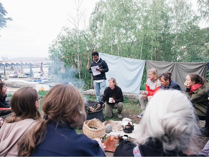 As part of the Academy of Rhythmorphology’s program at Oslo Fjord in September 2023, Robel Temesgen, in collaboration with Margrethe Pettersen, participated in a durational collective engagement designed to attune bodies to the rhythms of place and transformation. Held in the elevated part of the park near Bekkelaget Renseanlegg, the session invited participants into a transitional ritual of deep listening, storytelling, and cleansing through the burning and consumption of local herbs. A symbolic gift—a piece of polypore fungus—was offered to each participant to hold, smell, and burn, anchoring the experience in sensory and ancestral knowledge.