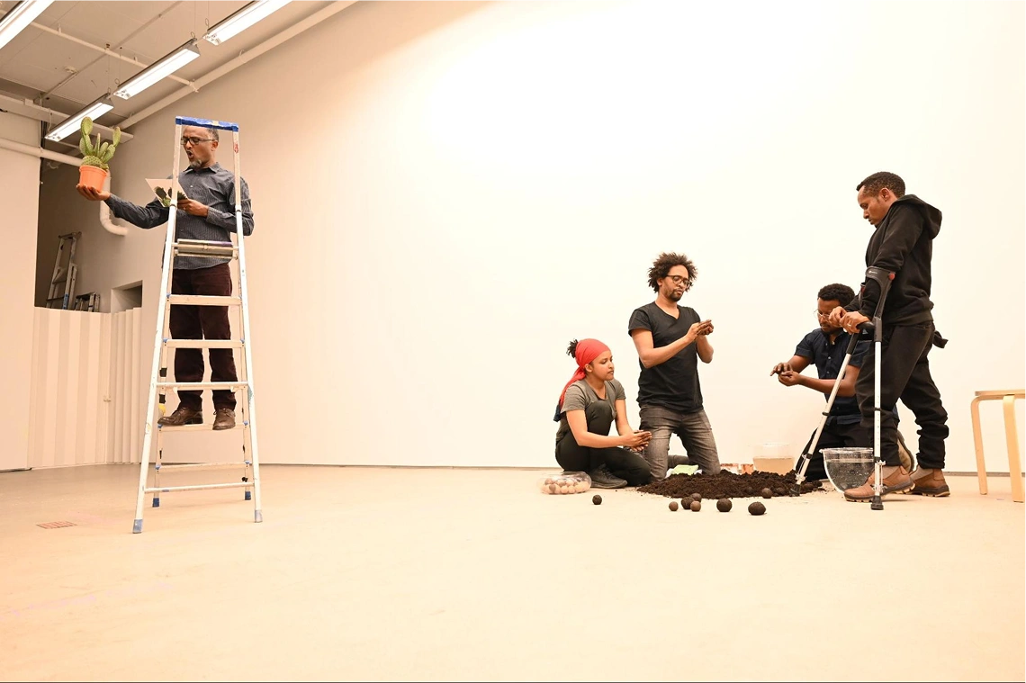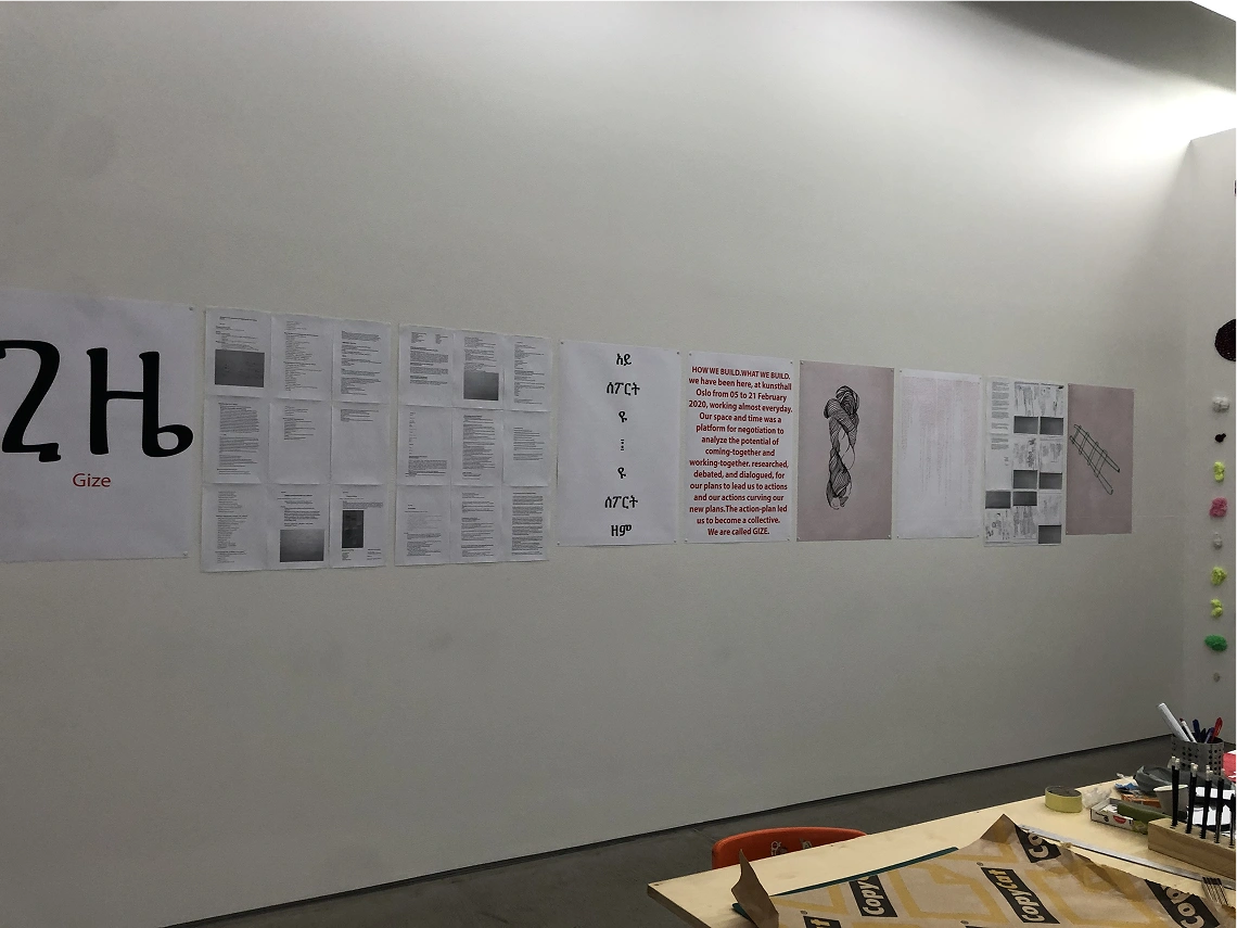 Gize is an artist collective founded in February 2020 by Berhanu Ashagrie, Helen Zeru, Robel Temesgen, and Tesfaye Bekele, emerging from the collaborative exhibition project Coming-together, held at Kunsthall Oslo in Oslo. Formed with a spirit of informality and temporality, Gize challenges conventional notions of collectivity, positioning itself as a protest against systemic constraints that hinder professional and political solidarity. Rooted in creative, pedagogical, and political engagement, the collective seeks to reimagine worldmaking through shared artistic processes. The name Gize, an Amharic term evoking time as force, motion, and transformation, encapsulates the collective’s ethos of evolving through events and encounters.