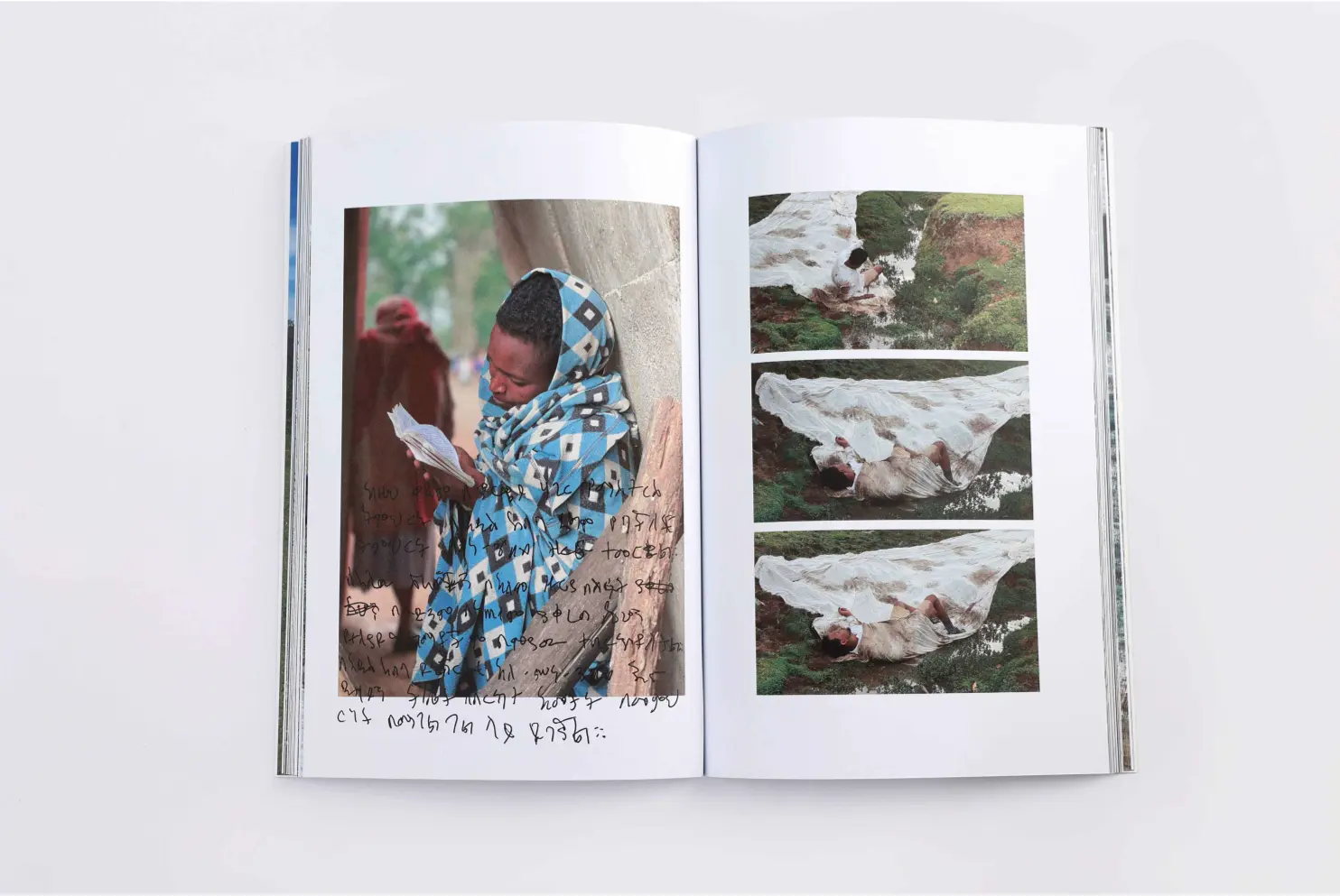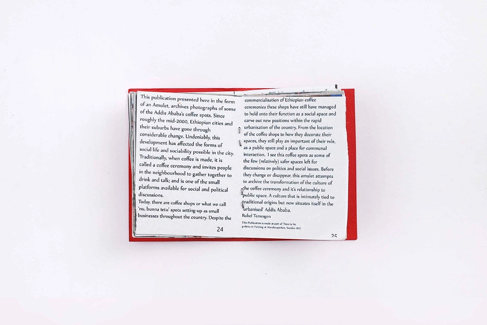 This publication in the form of an Amulet, archives photographs of some of the Addis Ababa's coffee spots. Since roughly the mid-2000, Ethiopian cities and their suburbs have gone through considerable change. Undeniably, this development has affected the forms of social life and sociability in the city. Culturally, making and drinking coffee is an invitation to people in the neighbourhood to come together and is one of the small hub available for social and political discussions. Today, there are coffee shops or 'nu, bunna tetu' spots setting-up as small businesses throughout the country. From the location to their setups of these coffee spots, I witness the importance of their role, as a public space and a place for communal interaction. Those spots have managed to carve new positions within the rapid 'development' in the country. From 2015 to 2019, this coffee spots are the few (and relatively) safer spaces left in the country for discussions on politics and social change. This amulet attempts to archive the transformation of public space that is intimately tied to traditional origins but situates itself within the 'urban'. As the book were published during the time when political reform was at the age and the nation was under State of Emergency, it was to undermine the physical presence in an attempt to avoid attention from authorities. This form of Amulet is common practice for protective prayers within the Coptic Orthodox church in Ethiopia. The publication was made as part of 'There is No Politics in Painting', a solo show at Marabouparken, Sweden, 2017.